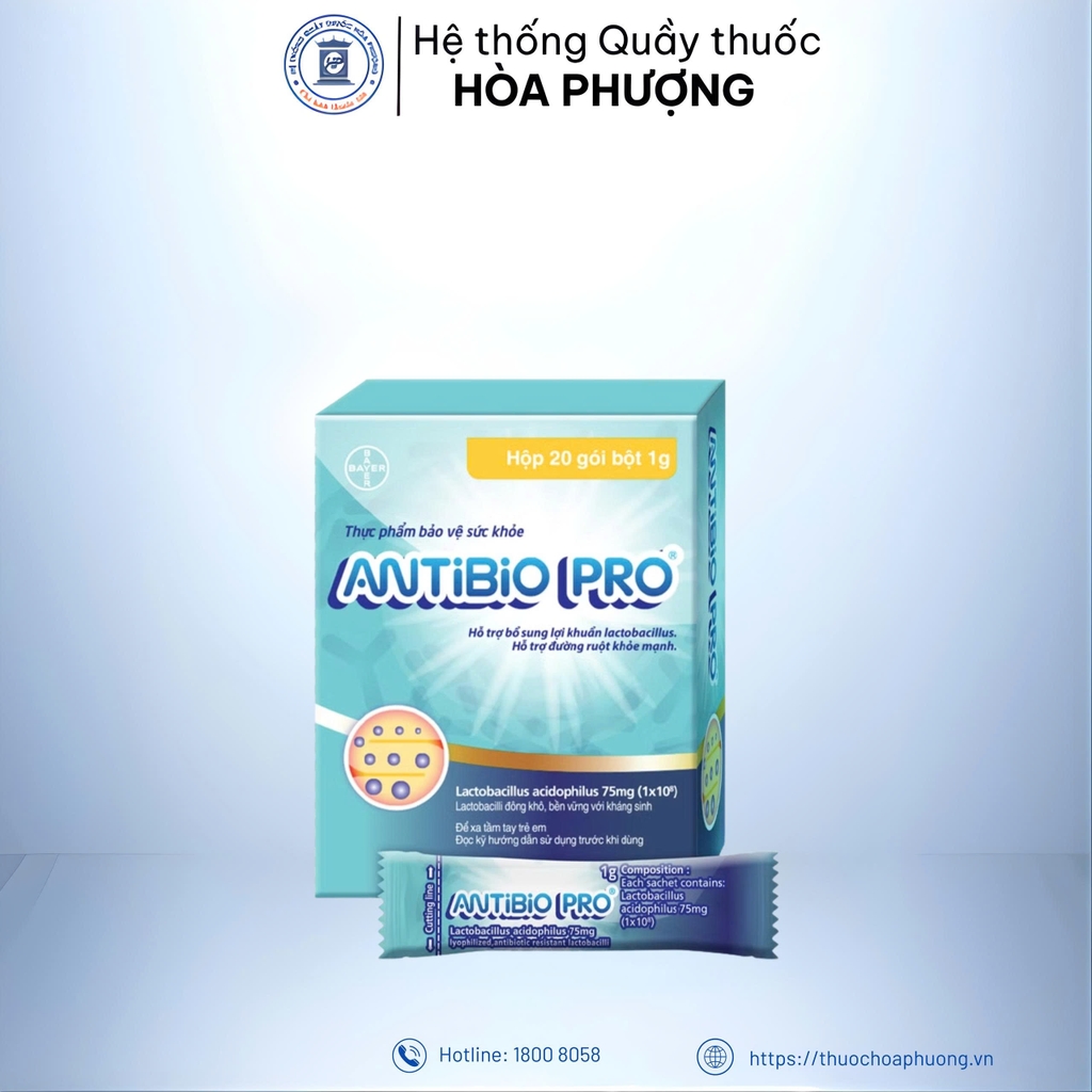 Mỗi gói Antibio pro nhỏ chứa Lactobacillus acidophilus 75mg (1 x 108 vi sinh sống).
