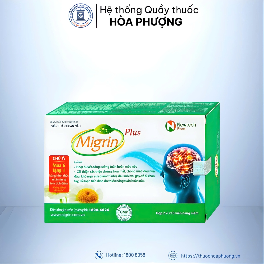 Migrin Plus hỗ trợ hoạt huyết, tăng cường tuần hoàn máu não, giúp cải thiện các triệu chứng: hoa mắt, chóng mặt, đau nửa đầu, khó ngủ, suy giảm trí nhớ, đau mỏi vai gáy, tê bì chân tay, rối loạn tiền đình do thiểu năng tuần hoàn não.
