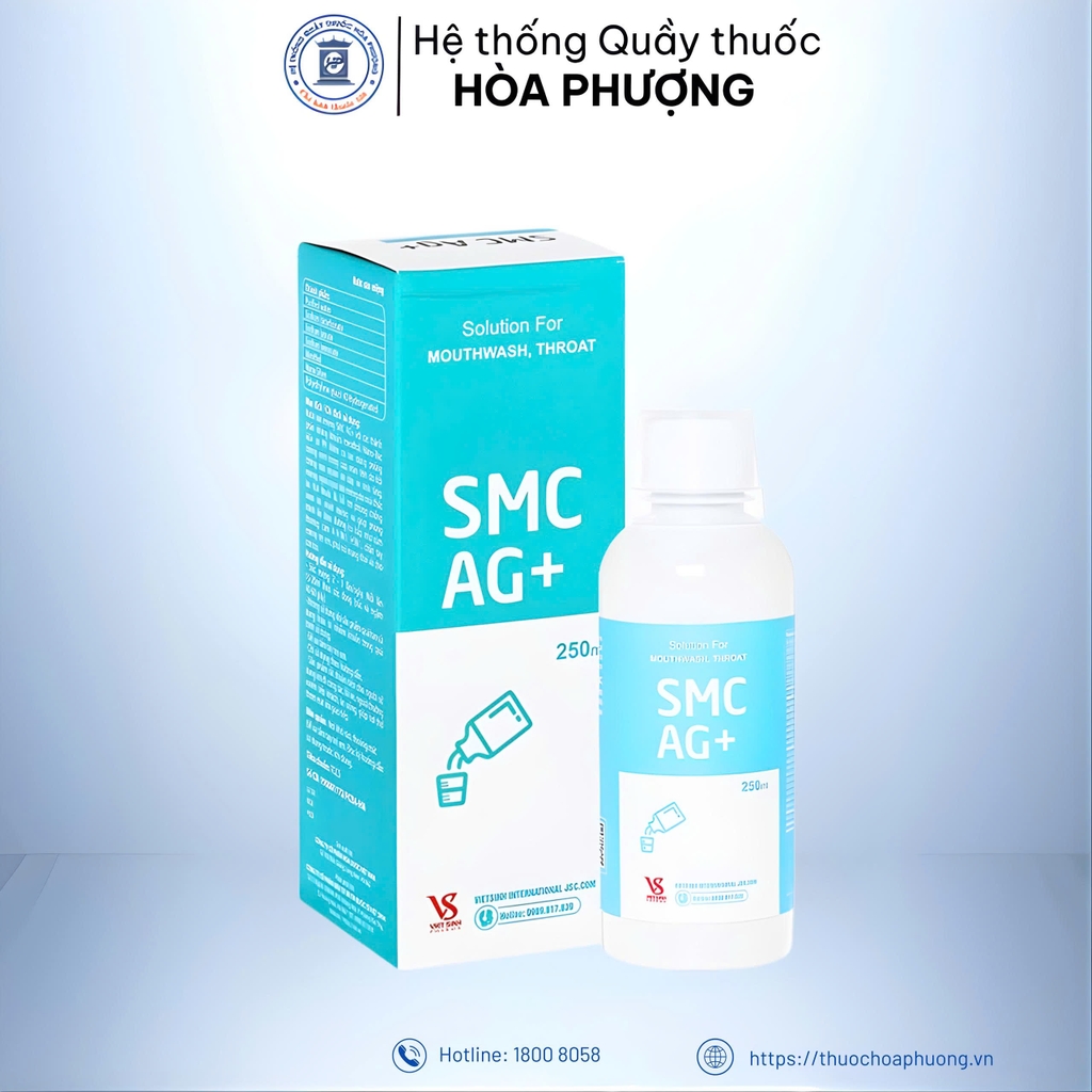 Nước súc miệng SMC Ag+ có các thành phần: Purified water, Sodium bicarbonate, Sodium borate, Sodium benzoate, Menthol, Nano Silver, Polyethyene glycol 40 Hydrogenated