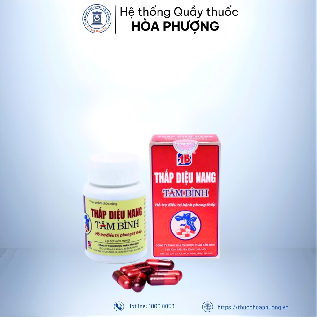 Thực phẩm bảo vệ sức khỏe (TPBVSK) Thấp diệu nang Tâm Bình do Công ty TNHH Sản xuất và Thương mại Dược phẩm Tâm Bình sản xuất với nguồn nguyên liệu xuất xứ rõ ràng, hỗ trợ cải thiện triệu chứng của đau thần kinh tọa, thần kinh liên sườn, đau do thoát vị đĩa đệm, gai cột sống, đau vai gáy, đau nhức mỏi xương khớp, tê buồn chân tay, thấp khớp, viêm khớp dạng thấp.