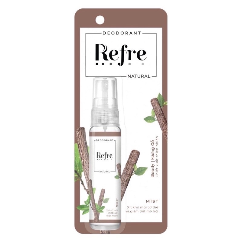 Xịt khử mùi Refre Natural Woody - Hương gỗ thích hợp với những bạn thích mùi hương ấm, không quá nồng. Không chỉ giúp ngăn mồ hôi, khử mùi hiệu quả, sản phẩm còn giúp kháng khuẩn, mang lại cho bạn một làn mềm mịn, sáng đẹp.